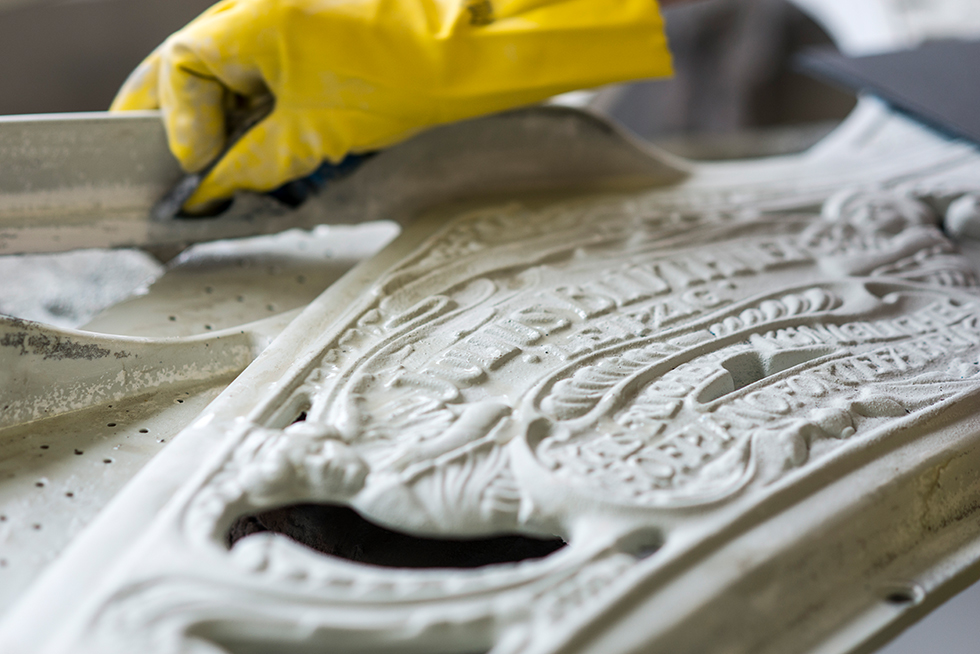 Khung sắt được tháo ra, phun cát đến tận phần kim loại trần và phun lại để giống với lớp hoàn thiện ban đầu. Cần rất nhiều giờ làm việc để phục hồi phần sắt, và để duy trì điều này, một lớp vecni bảo vệ được phủ lên để giữ cho khung được kín.