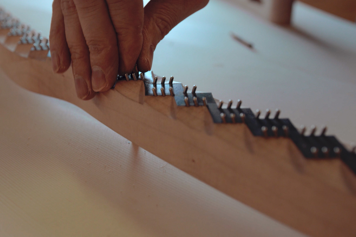 Cầu đàn được thiết kế để phù hợp với độ căng và độ cong của mặt đàn ở vị trí tối ưu, đảm bảo toàn bộ phổ rung động của dây đàn được truyền đến mặt đàn. Cả cầu đàn bass và treble đều được làm từ gỗ phong châu Âu. Khối chốt đàn hoặc tấm ván wrest được làm từ 14 lớp gỗ cứng nén chặt, được dán chéo và dán 90 độ theo hướng vân gỗ, giúp cố định chốt lên dây ở mọi mặt, đảm bảo độ ổn định lên dây lâu dài.